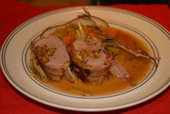 Das Schweinefilet mit einer Walnuss-Honig-Füllung mit Kürbis und Birnen ist ein typisches Honigrezept für die Herbstzeit.